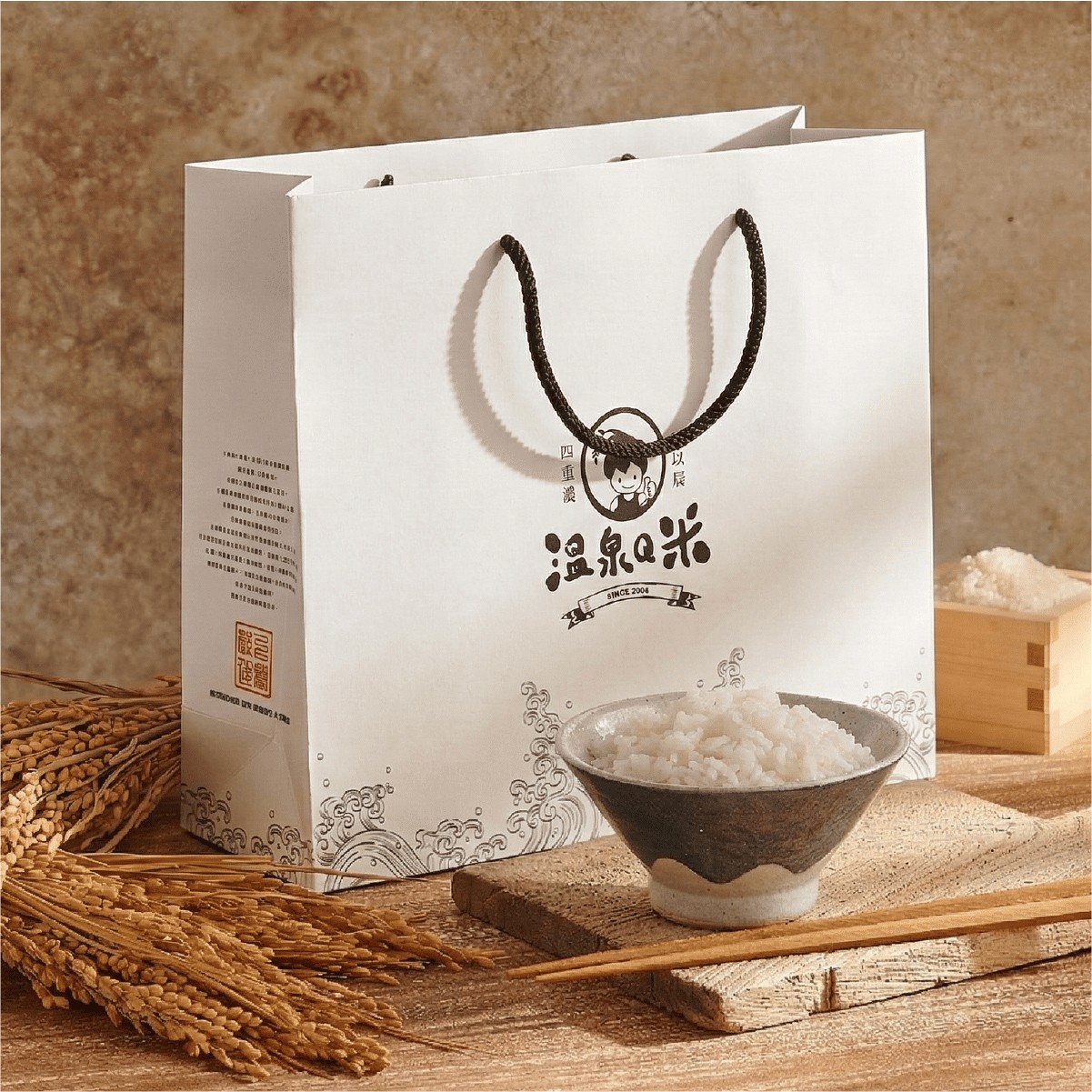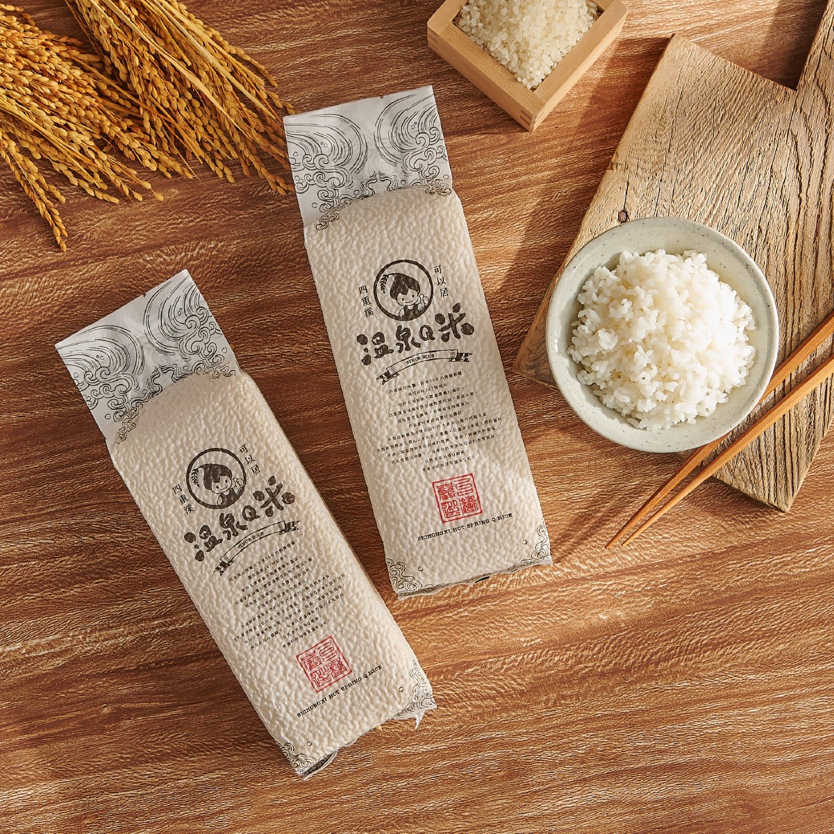 為了拉近消費者與優質好米之間的距離,我們創造了品牌專屬 IP「溫泉Q米寶」。包裝視覺以圓潤、可愛的角色形象作為主體,巧妙結合「溫泉浴」的意象,象徵稻米受四重溪溫泉水滋潤的成長過程。活潑的插畫線條與明快的配色,賦予了產品強烈的生命力與記憶點,打破大眾對傳統米袋包裝的刻板印象。這種角色驅動的設計手法,不僅增加了視覺的趣味性,更透過「Q」的直覺感受,精準傳達了產品口感飽滿、香Q好吃的特色。